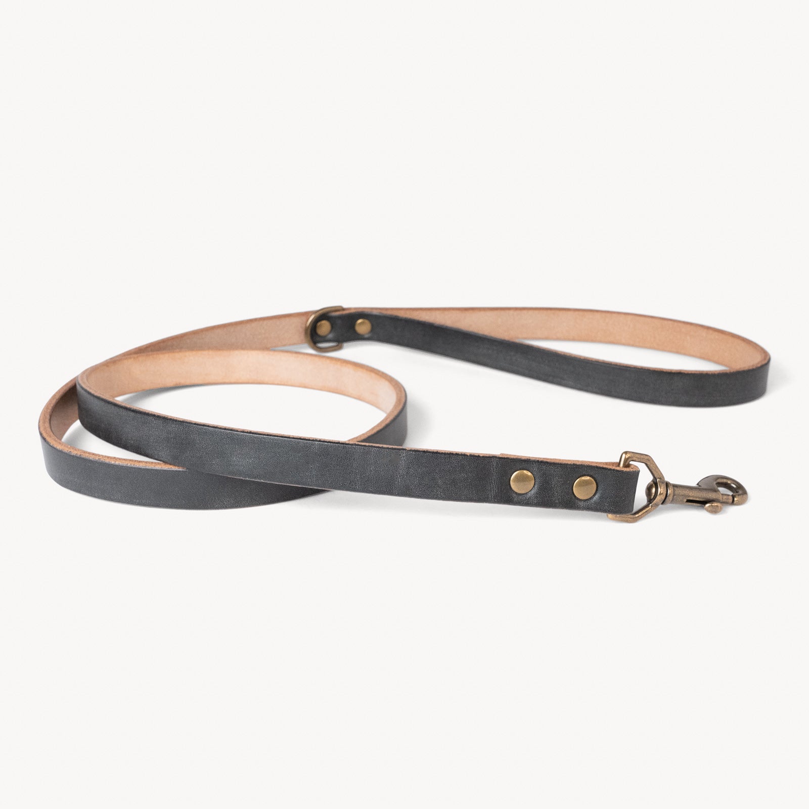 All Heritage leashes are built by hand and made to order in my Pacific Northwest workshop. Straps are measured and cut from a full hide, then ends punched, and edges beveled and burnished. Hardware is connected using rivets and then the handle is burnished with a cloth for a shine finish.