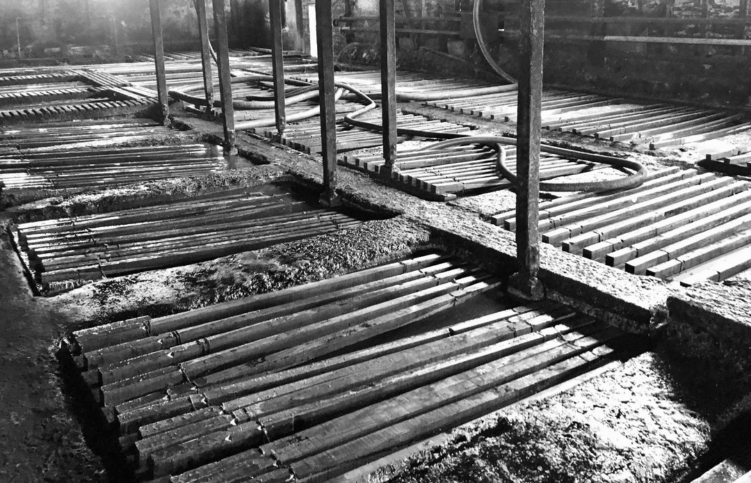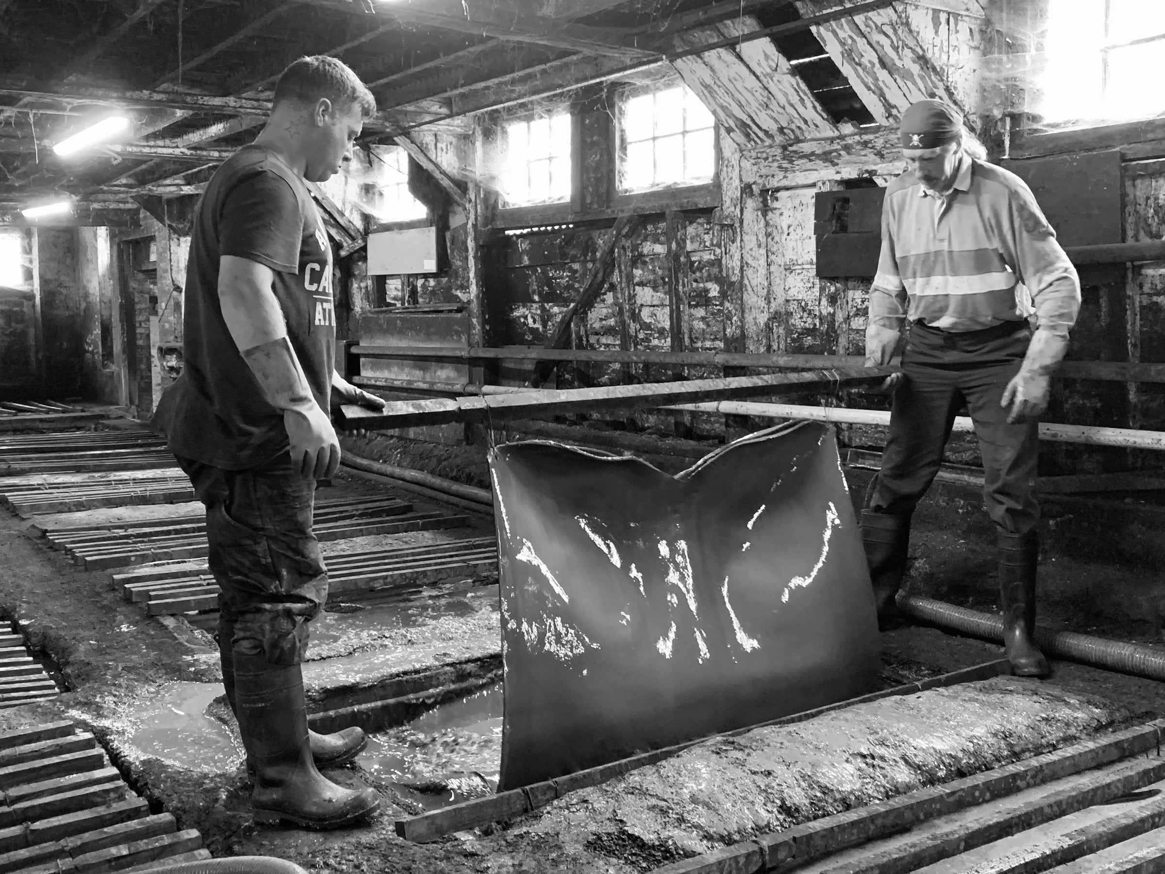 Now bare, the hides are washed in oak bark tannin for 3 months and set in a pit for another 9 months, layered flat with ground oak bark from Coppiced UK trees between each piece. Once the tanning process is complete, each hide is greased with a variety of fats, liquors, and oils to strengthen the fibers, then dried in a drying shed with a biomass boiler.